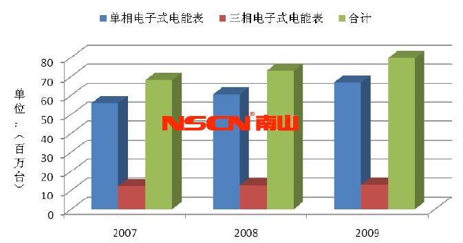2007-2009年我國電 子式電能表產(chǎn)量分別為6,809.36萬臺(tái)、7,297.73萬臺(tái)、7,974.99萬臺(tái),2008年同比增長7.17%,2009年同比增長 9.28%,其中,單相電子式電能表2008年同比增長8.09%,2009年同比增長10.76%,電子式電能表市場需求總體呈現(xiàn)持續(xù)增長的良好態(tài)勢。
