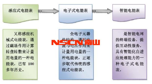 電工儀器儀表行業(yè)總體屬于完 全競爭行業(yè)。電能表作為電工儀器儀表中的一個(gè)重要產(chǎn)品,是用于電力系統(tǒng)發(fā)電、輸電、變電、配電、用電等各個(gè)環(huán)節(jié)電能計(jì)量的法定計(jì)量器具。電能表產(chǎn)品的競爭 格局隨著電能表產(chǎn)品本身的升級(jí)換代而變化,電能表的發(fā)展經(jīng)歷了感應(yīng)式電能表、電子式電能表與智能電能表三個(gè)階段,如下圖所示: