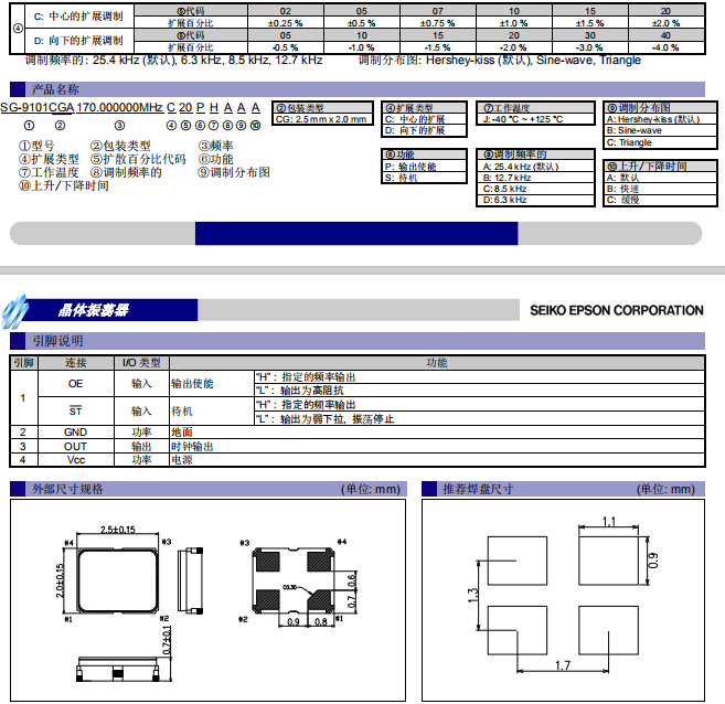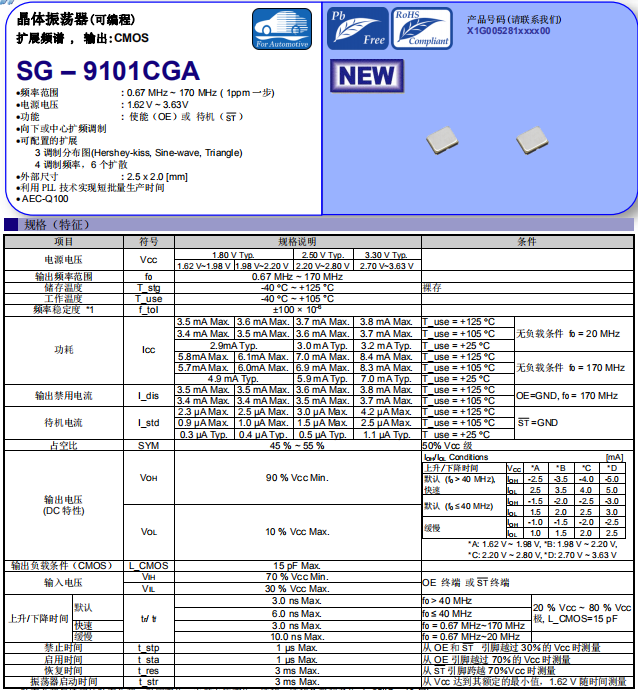 大家好,今天給大家介紹車規(guī)級(jí)晶振SG-9101CGA。首先SG-9101CGA屬于愛普生9101系列,是一款可編程晶振。SG-9101CGA車規(guī)級(jí)晶振采用2.5x2.0mm封裝,利用PLL技術(shù)生產(chǎn),此款振蕩器的頻率范圍從0.67M~170MHZ任一頻點(diǎn)可選,步進(jìn)1ppm,采用標(biāo)準(zhǔn)CMOS輸出,輸出負(fù)載為15pF,有良好的頻率穩(wěn)定性。SG-9101CGA系列車規(guī)級(jí)晶振采用低供電電壓,范圍為1.62V~3.63V,且具有低功耗特性。在25℃,1.8V/2.5V/3.3V下,SG-9101CGA空載電流消耗典型值分別為4.9mA /5.9mA /7.0mA。過ST端口可實(shí)現(xiàn)待機(jī)模式,進(jìn)一步降低設(shè)備的功率損耗。SG-9101CGA系列車規(guī)級(jí)晶振工作溫度范圍為-40℃~+125℃,無鉛,綠色環(huán)保,滿足汽車工業(yè)標(biāo)準(zhǔn)。另外,此款車規(guī)級(jí)晶振采用小尺寸貼片封裝,尺寸僅為2.5×2.0×0.7mm,能在對(duì)空間敏感的汽車電子應(yīng)用中更加得心應(yīng)手。SG-9101CGA功耗低至0.3μA,工作溫度高達(dá)125℃,符合RoHS要求和AEC-Q100標(biāo)準(zhǔn),適合應(yīng)用于汽車多媒體、車載導(dǎo)航系統(tǒng)和遙控鑰匙等車載電子設(shè)備。下面南山電子就給大家分享下車規(guī)級(jí)晶振SG-9101CGA的規(guī)格書,以供大家選型推廣。