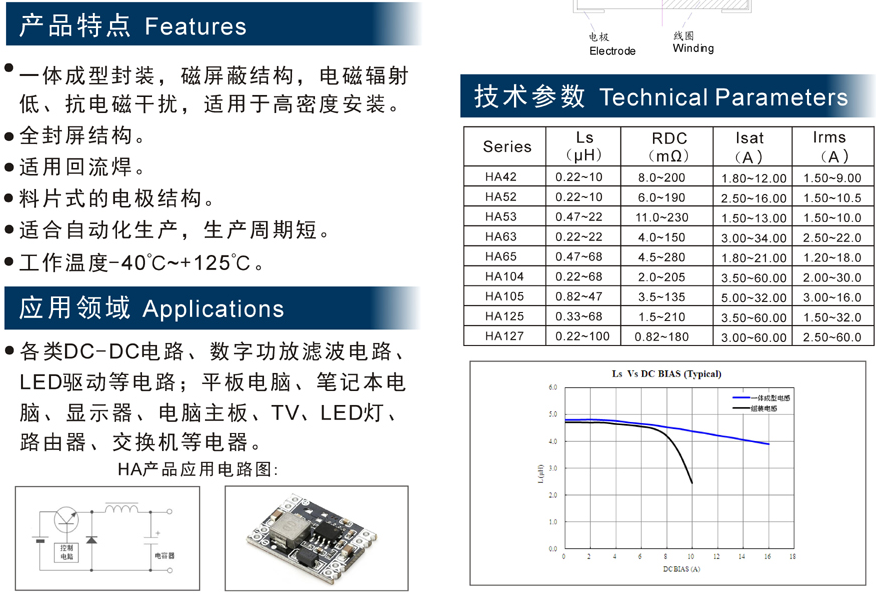 風(fēng)華HA系列一體成型功率電感產(chǎn)品特點技術(shù)參數(shù)等如下圖所示:
