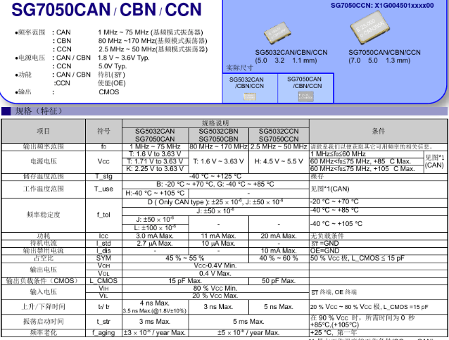 大家好,近期很多客戶詢問一款50MHz晶振SG7050CAN,50MHz,TJGA,X1G00448100120050MHz晶振是應(yīng)用比較廣泛的一種頻率,其實(shí)常用的50MHz晶振大部分是50MHz有源晶振,可以用于銀行金融系統(tǒng),稅控系統(tǒng),遠(yuǎn)程抄表系統(tǒng),加密狗,測(cè)試儀器,超聲頻,網(wǎng)絡(luò)傳輸ADSL,安防(攝像頭,報(bào)警器)等,當(dāng)然熱門的還有比如溫補(bǔ)類型50MHz晶振TG5006CG 50MHz,南山電子給大家分享下50MHz晶振:SG7050CAN,50MHz,TJGA,X1G004481001200的規(guī)格書以供大家選型參考: