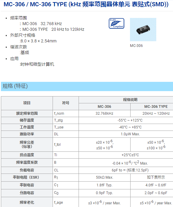 用于時(shí)鐘和微型計(jì)算機(jī)的8038無源晶振:MC-306