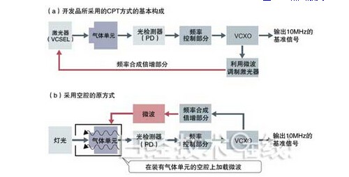 原來的方式采用燈光作為光源,在容納氣體單元的“空腔”容器上加載微波。當空腔變小時,長期頻率穩(wěn)定度就會降低,因此小型化存在限制。