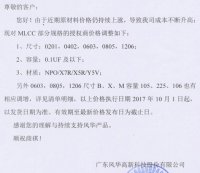 自2016年第三季度至今,被動元件價(jià)格持續(xù)上漲,至今已經(jīng)有過幾輪,風(fēng)華電容近日又再一次向各代理商下方了統(tǒng)一漲價(jià)通知,最新價(jià)格生效時(shí)間為2017年10月1日。產(chǎn)品主要涉及 MLCC 和 R...