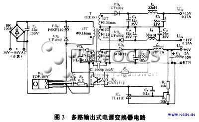 多路輸出式電源變換器電路如圖3所示。其輸入電壓為36V到90V的準方波電壓,三路輸出分別為:UO1=+5V(2A),UO2=+15V(0.17A),UO3=-15V(0.17A)?,F(xiàn)將UO1定為主輸出,其電壓調(diào)整率SV=±0.4%;UO2和UO3為輔輸出,總電源效率可達75%~80%。電路中采用一片TOP104Y型三端單片開關(guān)電源集成電路。主輸出繞組電壓經(jīng)過VD2、C2、L1和C3整流濾波后,得到+5V電壓。VD2采用MBR735型35V/7.5A肖特基二極管。兩個輔輸出繞組及輸出電路完全呈對稱結(jié)構(gòu)。因為±15V輸出電流較小,故整流管VD4和VD5均采用UF4002型100V/1A的超快恢復(fù)二極管。由線性光耦CNY17-2和可調(diào)式精密并聯(lián)穩(wěn)壓器TL431C構(gòu)成光耦反饋式精密開關(guān)電源,可以對+5V電壓進行精密調(diào)整。反饋繞組電壓通過VD3、C4整流濾波后,得到12V反饋電壓。由P6KE120型瞬態(tài)電壓抑制器和UF4002型超快恢復(fù)二極管構(gòu)成的漏極鉗位保護電路,能吸收由高頻變壓器漏感形成的尖峰電壓,保護芯片內(nèi)部的功率場效應(yīng)管MOSFET不受損壞。