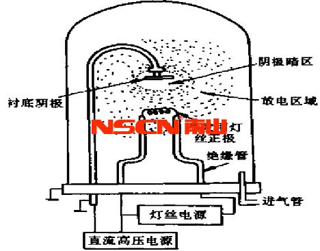 蒸發(fā)物質(zhì)的分子被電子撞擊后沉積在固體表面稱為離子鍍。蒸發(fā)源接陽(yáng)極,工件接陰極,當(dāng)通以三至五千伏高壓直流電以后,蒸發(fā)源與工件之間產(chǎn)生輝光放電。由于真空罩內(nèi)充有惰性氬氣,在放電電場(chǎng)作用下部分氬氣被電離,從而在陰極工件周圍形成一等離子暗區(qū)。帶正電荷的氬離子受陰極負(fù)高壓的吸引,猛烈地轟擊工件表面,致使工件表層粒子和臟物被轟濺拋出,從而使工件待鍍表面得到了充分的離子轟擊清洗。隨后,接通蒸發(fā)源交流電源,蒸發(fā)料粒子熔化蒸發(fā),進(jìn)入輝光放電區(qū)并被電離。帶正電荷的蒸發(fā)料離子,在陰極吸引下,隨同氬離子一同沖向工件,當(dāng)拋鍍于工件表面上的蒸發(fā)料離子超過濺失離子的數(shù)量時(shí),則逐漸堆積形成一層牢固粘附于工件表面的鍍層。如圖4