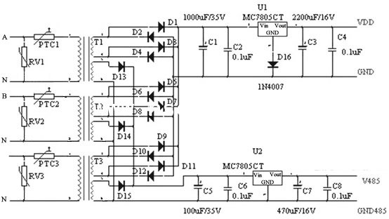 變壓器對各相的電壓進(jìn)行變壓,然后通過整流穩(wěn)壓電路對電表供電。