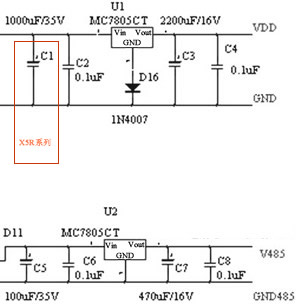 電容會有充電、放電的過程。這樣,整流后的信號將產(chǎn)生如下變化。變?yōu)檫B續(xù)的更接近 直流的電壓。C5是對D13(485繞組)整流后的波形進(jìn)行濾波。C3、C7分別對U1、U2輸出的電壓進(jìn)行濾波:使波形更 穩(wěn)定。