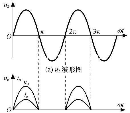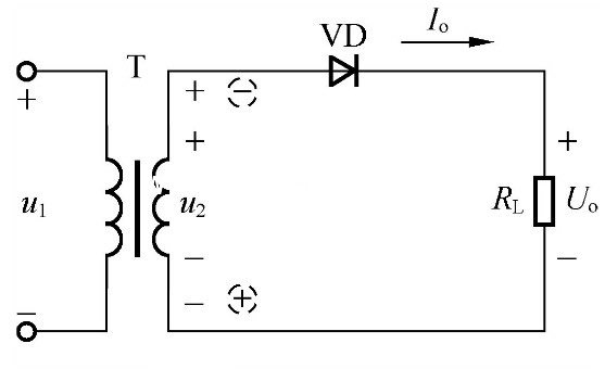 交流電壓u1經(jīng)過(guò)變壓器變壓為u2。當(dāng)交流電壓在正半周時(shí),VD受到正向電壓作用導(dǎo)通,電流經(jīng)過(guò)負(fù)載RL產(chǎn)生輸出電壓u0。在交流電壓負(fù)半周時(shí),VD受到反向電壓作用不能導(dǎo)通,RL上無(wú)輸出電壓,這樣就將交流電的波形就變?yōu)橄聢D所示。