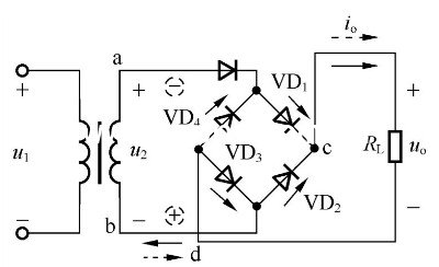 在交流電壓正半周時(shí),VD1導(dǎo)通,VD3導(dǎo)通。所以電流從a點(diǎn)經(jīng)VD1再到c點(diǎn),流過(guò)負(fù)載Rl,通過(guò)VD3流回b。而在電壓負(fù)半周時(shí),VD2與VD4導(dǎo)通,電流從b點(diǎn)流經(jīng)VD2,經(jīng)過(guò)c點(diǎn),流過(guò)負(fù)載,通過(guò)VD4流回a點(diǎn)。這樣無(wú)論輸入端在正半周還是負(fù)半周,輸出端都是單一的方向。如下圖