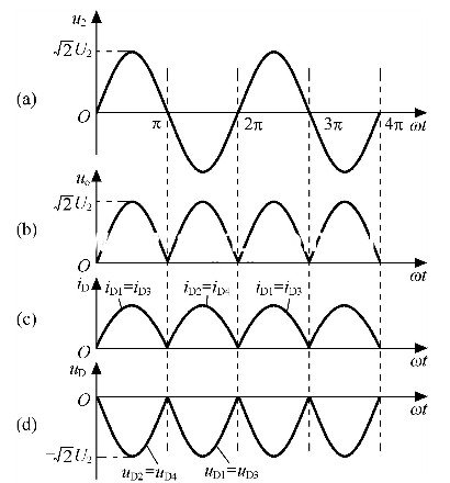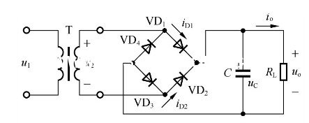 橋式整流克服了半波整流波形不連續(xù)的缺點(diǎn),由四個(gè)二極管構(gòu)成電橋。如下圖