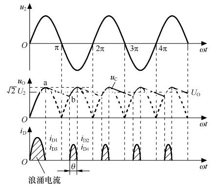 我們?cè)陔姼袨V波電路負(fù)載RL上并聯(lián)一個(gè)電容C以增加濾波效果,可以使我們得到較大輸出電流的同時(shí)減小電壓波動(dòng)。