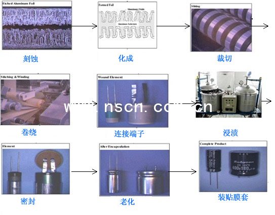 陽極和陰極金屬箔是由高純度的,很薄的只有0.02—0.1mm鋁箔做成的,為了增加盤面積和電容量,與電解液接觸的表面積的增加是通過蝕刻金屬箔去溶解鋁,使整個(gè)鋁箔的表面形成一個(gè)高密度的網(wǎng)狀的有幾十億個(gè)精細(xì)微管道的結(jié)構(gòu)。蝕刻技術(shù)是牽引在滾筒上的鋁箔通過氯化物溶液,并且在蝕刻溶液和鋁箔之間加AC,DC或AC-&-DC電壓。表面面積對于低壓電容來說可以增加100倍,對于高壓電容來說可以增加20-25倍。