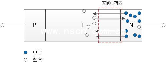 在零偏置電壓的狀態(tài)下,I區(qū)與N區(qū)的界面,由于I層摻雜有少量的P型雜質(zhì),所以這時(shí)I區(qū)與N區(qū)間就相當(dāng)于形成了一個(gè)PN結(jié)。N區(qū)的電子向I區(qū)擴(kuò)散,I區(qū)的空穴向N區(qū)擴(kuò)散,I區(qū)與P區(qū)上就形成了一個(gè)空間電荷區(qū)。N區(qū)的電子濃度很高,所以N區(qū)一邊的空間電荷區(qū)很薄。I區(qū)的摻雜濃度較低,整個(gè)空間電荷區(qū)的大小幾乎與I層的空間電荷區(qū)大小相等。如下圖所示。
